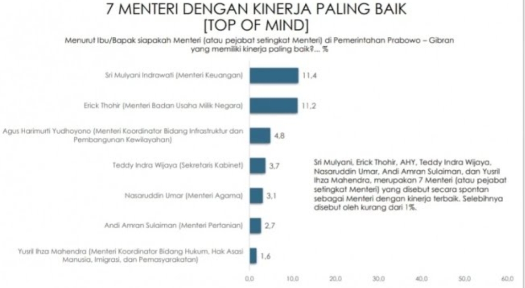 “Artinya penilaian kinerja paling banyak itu sangat dipengaruhi oleh awareness responden terhadap nama-nama menteri yang ada di kepala mereka. Sehingga ketika kita kasih daftar nama sekalipun, tidak berkurang signifikan terhadap nama-nama yang dipersepsi positif ini,” ujar Burhanuddin.