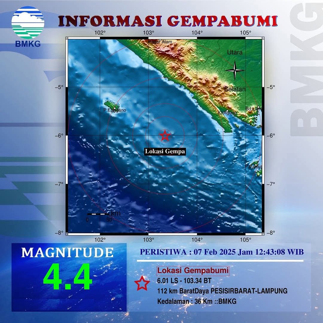 PESISIRBARAT – Gempa dengan kekuatan Magnitudo 4,4 mengguncang wilayah Pesisir Barat Lampung, Jumat 7 Februari 2025 pada Pukul 12.43 Wib.