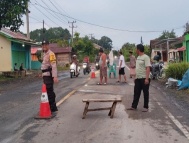 TANGGAMUS- Guna mengurangi risiko kecelakan akibat ruas jalan rusak dan berlubang, Bhabinkamtibmas Polsek Wonosobo Polres Tanggamus bersama masyarakat Pekon Negeri Agung, Kecamatan Bandar Negeri Semuong, melaksanakan gotong royong perbaikan jalan secara swadaya.